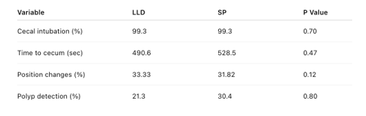 Figure 3:Comparison of cecal intubation, procedure time, position changes, and polyp detection between left lateral decubitus and supine positions.